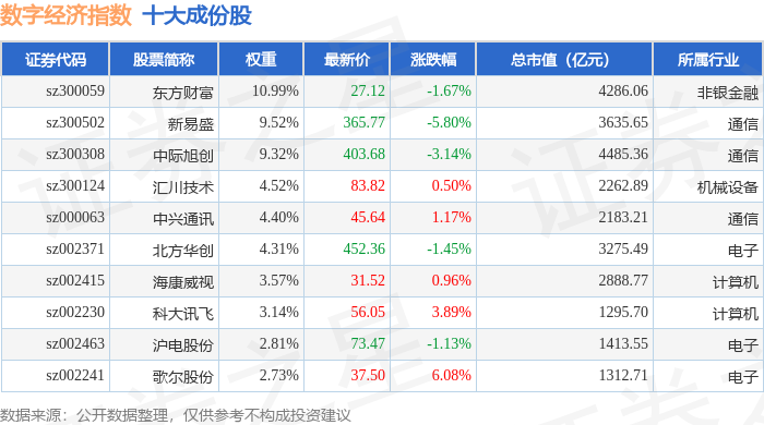 数字经济(399262)指数十大成份股详情如下:
