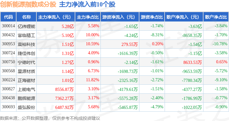 资金流向方面,创新能源(399266)指数成份股当日主力资金净流出合计12.33亿元,游资资金净流出合计3.37亿元,散户资金净流入合计15.7亿元。成份股资金流向详情见下表:
