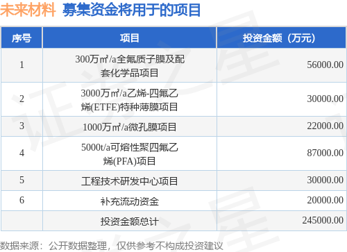 证券之星消息,山东东岳未来氢能材料股份有限公司(简称:未来材料)拟在上交所科创板上市,募资总金额为24.46亿元,保荐机构为中信证券股份有限公司。募集资金拟用于300万㎡/a全氟质子膜及配套化学品项目、3000万㎡/a乙烯-四氟乙烯(ETFE)特种薄膜项目、1000万㎡/a微孔膜项目、5000t/a可熔性聚四氟乙烯(PFA)项目、工程技术研发中心项目、补充流动资金,详见下表: