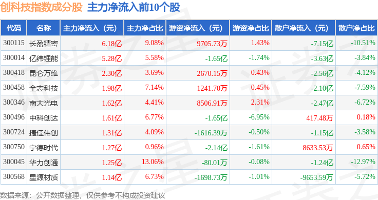 资金流向方面,创科技(399276)指数成份股当日主力资金净流出合计17.01亿元,游资资金净流入合计16.11亿元,散户资金净流入合计8945.42万元。成份股资金流向详情见下表: