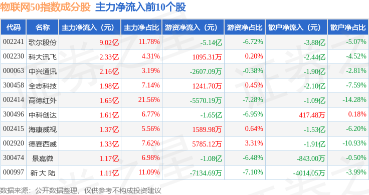 资金流向方面,物联网50(399285)指数成份股当日主力资金净流出合计40.6亿元,游资资金净流入合计23.53亿元,散户资金净流入合计17.07亿元。成份股资金流向详情见下表: