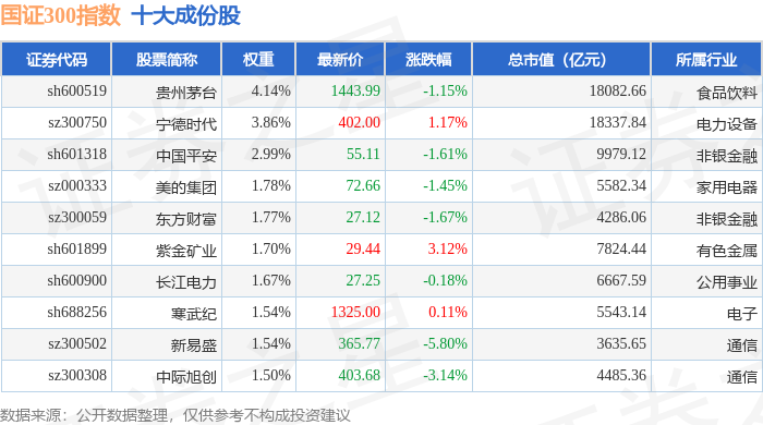 国证300(399312)指数十大成份股详情如下: