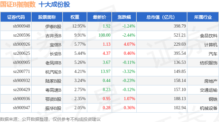 证券之星消息,9月30日,国证B指(399318)指数报收于5379.45点,跌0.2%,成交3.09亿元,换手率0.23%。当日该指数成份股中,上涨的有28家,汇丽B以7.07%的涨幅领涨,下跌的有35家,杭汽轮B以3.32%的跌幅领跌。