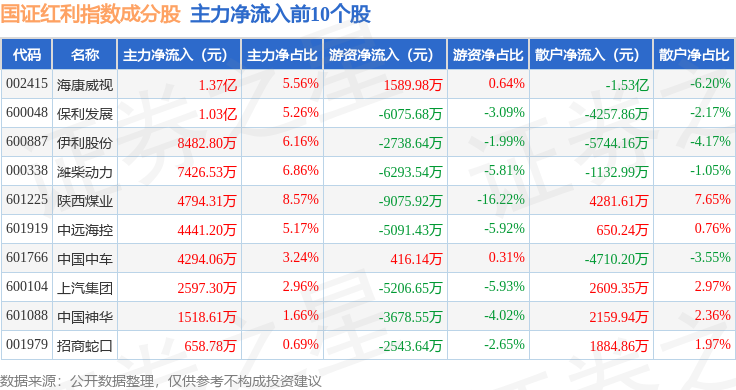 资金流向方面,国证红利(399321)指数成份股当日主力资金净流出合计80.59亿元,游资资金净流入合计36.72亿元,散户资金净流入合计43.87亿元。成份股资金流向详情见下表: