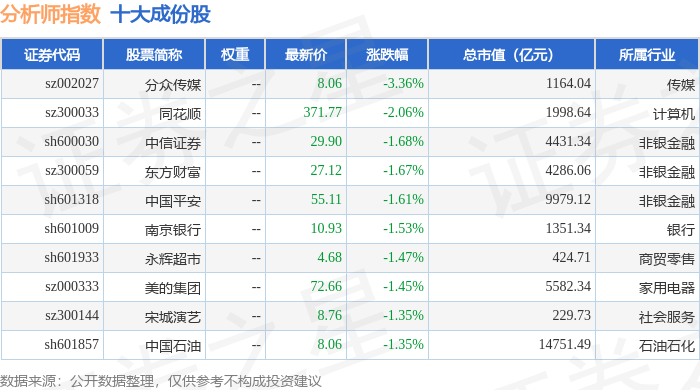 资金流向方面,分析师指数(399354)成份股当日主力资金净流出合计77.96亿元,游资资金净流入合计33.61亿元,散户资金净流入合计44.35亿元。成份股资金流向详情见下表: