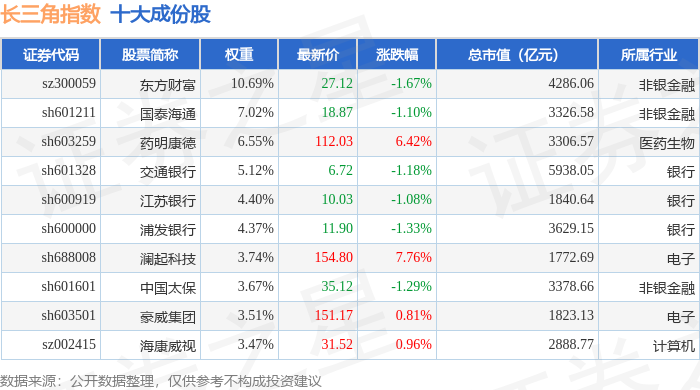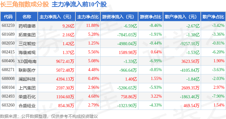 资金流向方面,长三角(399355)指数成份股当日主力资金净流出合计51.95亿元,游资资金净流入合计22.52亿元,散户资金净流入合计29.42亿元。成份股资金流向详情见下表: