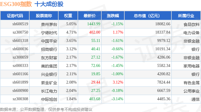 ESG300(399378)指数十大成份股详情如下:
