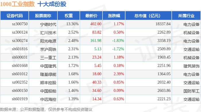 1000工业(399383)指数十大成份股详情如下: