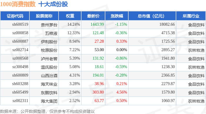 证券之星消息,9月30日,1000消费(399385)指数报收于9946.82点,跌0.33%,成交269.35亿元,换手率0.83%。当日该指数成份股中,上涨的有17家,东鹏饮料以4.56%的涨幅领涨,下跌的有37家,酒鬼酒以3.78%的跌幅领跌。