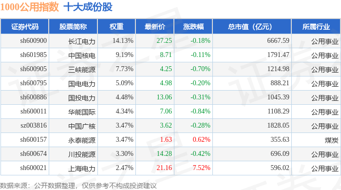 1000公用(399390)指数十大成份股详情如下: