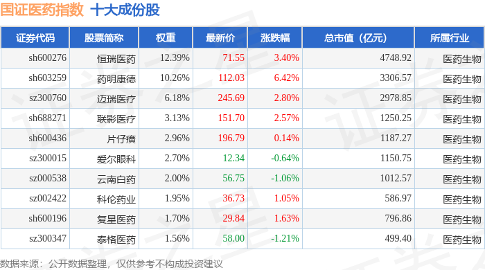 证券之星消息,9月30日,国证医药(399394)指数报收于9725.43点,涨1.81%,成交409.47亿元,换手率0.97%。当日该指数成份股中,上涨的有50家,药明康德以6.42%的涨幅领涨,下跌的有29家,吉林敖东以1.91%的跌幅领跌。