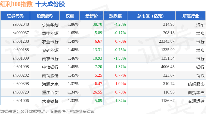 证券之星消息,9月30日,红利100(399411)指数报收于3419.96点,跌0.45%,成交443.09亿元,换手率0.35%。当日该指数成份股中,上涨的有32家,四方股份以5.65%的涨幅领涨,下跌的有63家,鲁阳节能以5.41%的跌幅领跌。