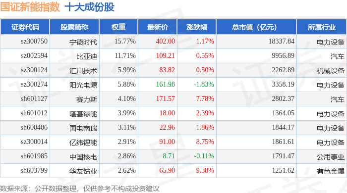 国证新能(399412)指数十大成份股详情如下: