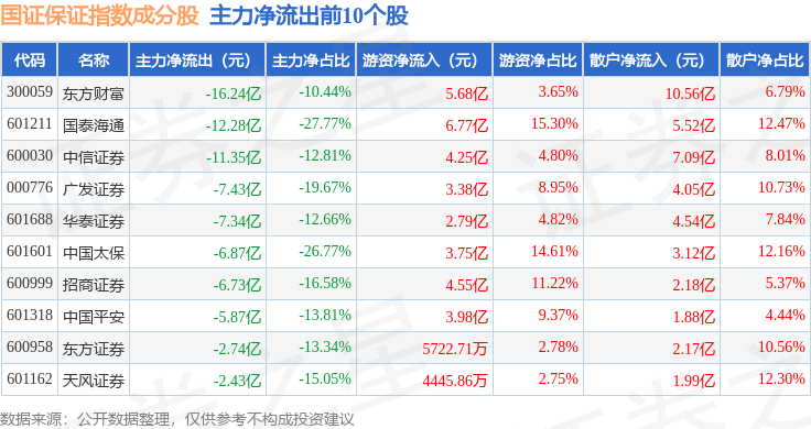 资金流向方面,国证保证(399420)指数成份股当日主力资金净流出合计98.42亿元,游资资金净流入合计40.64亿元,散户资金净流入合计57.78亿元。成份股资金流向详情见下表: