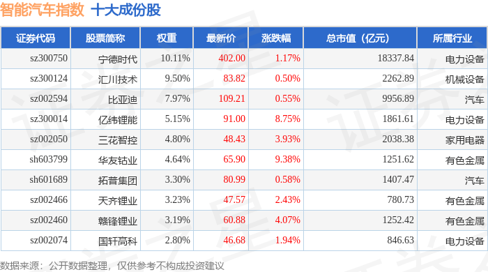 证券之星消息,9月30日,智能汽车(399432)指数报收于7167.75点,涨2.28%,成交1250.73亿元,换手率4.21%。当日该指数成份股中,上涨的有33家,华友钴业以9.38%的涨幅领涨,下跌的有17家,旭升集团以3.46%的跌幅领跌。