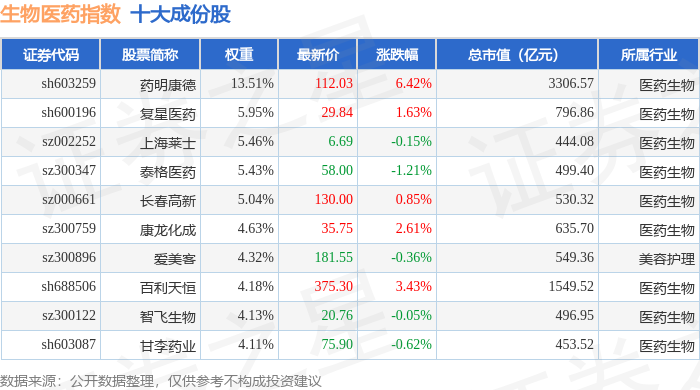 证券之星消息,9月30日,生物医药(399441)指数报收于2506.94点,涨1.75%,成交201.13亿元,换手率1.23%。当日该指数成份股中,上涨的有21家,药明康德以6.42%的涨幅领涨,下跌的有8家,泰格医药以1.21%的跌幅领跌。