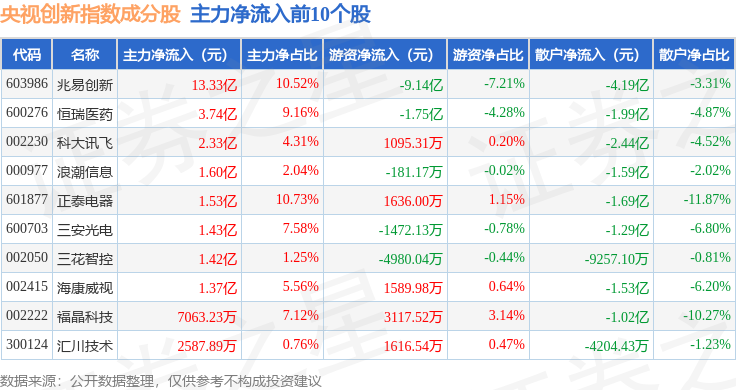 资金流向方面,央视创新(399551)指数成份股当日主力资金净流出合计6.89亿元,游资资金净流出合计3.41亿元,散户资金净流入合计10.3亿元。成份股资金流向详情见下表: