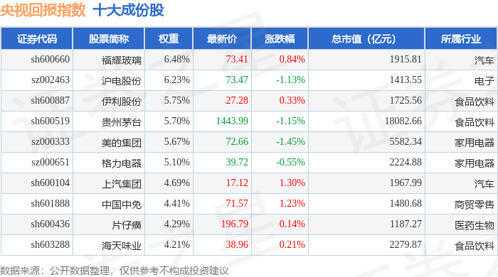 央视回报(399553)指数十大成份股详情如下: