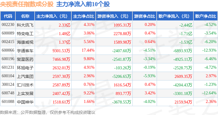 资金流向方面,央视责任(399555)指数成份股当日主力资金净流出合计29.99亿元,游资资金净流入合计12.93亿元,散户资金净流入合计17.06亿元。成份股资金流向详情见下表: