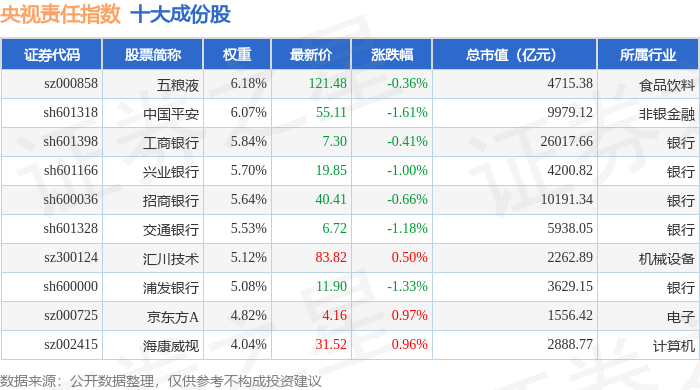 证券之星消息,9月30日,央视责任(399555)指数报收于5264.87点,涨0.02%,成交526.66亿元,换手率0.57%。当日该指数成份股中,上涨的有23家,上实发展以6.38%的涨幅领涨,下跌的有26家,中国平安以1.61%的跌幅领跌。