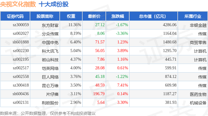 证券之星消息,9月30日,央视文化(399557)指数报收于2046.87点,涨0.36%,成交587.41亿元,换手率2.93%。当日该指数成份股中,上涨的有29家,昆仑万维以7.41%的涨幅领涨,下跌的有17家,无线传媒以3.73%的跌幅领跌。