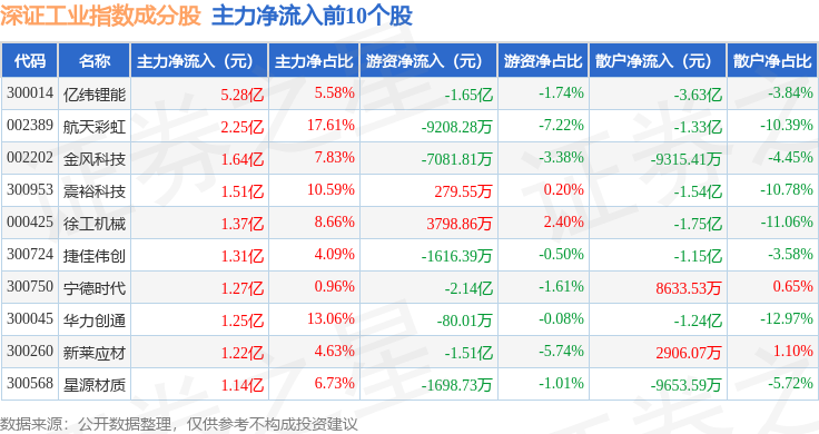 资金流向方面,深证工业(399615)指数成份股当日主力资金净流出合计40.08亿元,游资资金净流入合计4.67亿元,散户资金净流入合计35.41亿元。成份股资金流向详情见下表: