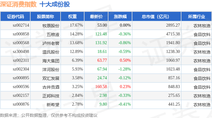 证券之星消息,9月30日,深证消费(399617)指数报收于10129.25点,跌0.33%,成交97.21亿元,换手率0.75%。当日该指数成份股中,上涨的有6家,圣农发展以1.75%的涨幅领涨,下跌的有13家,洋河股份以1.28%的跌幅领跌。