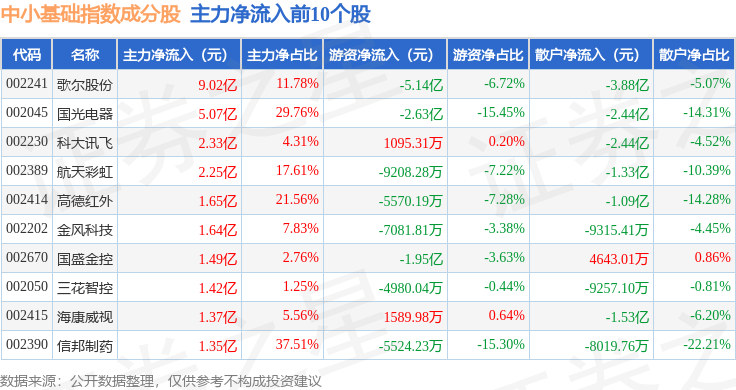 资金流向方面,中小基础(399623)指数成份股当日主力资金净流出合计88.54亿元,游资资金净流入合计16.8亿元,散户资金净流入合计71.74亿元。成份股资金流向详情见下表: