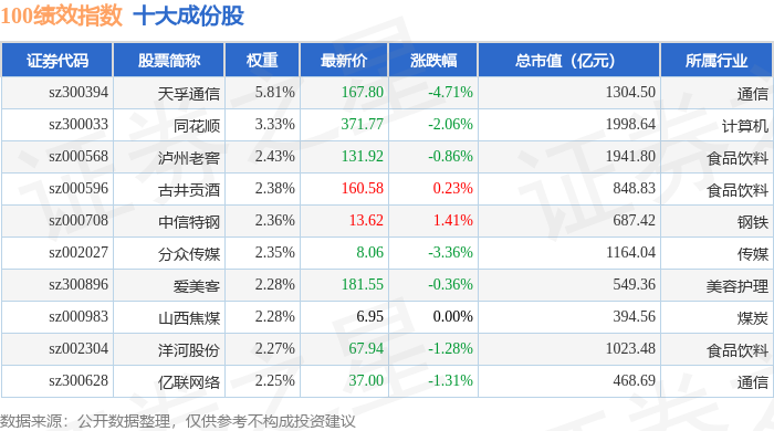 证券之星消息,9月30日,100绩效(399656)指数报收于6562.84点,涨0.0%,成交2865.06亿元,换手率1.55%。当日该指数成份股中,上涨的有55家,亿纬锂能以8.75%的涨幅领涨,下跌的有43家,新易盛以5.8%的跌幅领跌。