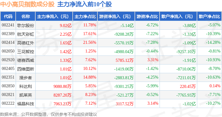 资金流向方面,中小高贝(399664)指数成份股当日主力资金净流出合计58.66亿元,游资资金净流入合计14.83亿元,散户资金净流入合计43.83亿元。成份股资金流向详情见下表: