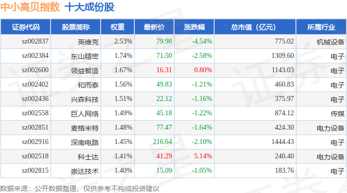 中小高贝(399664)指数十大成份股详情如下: