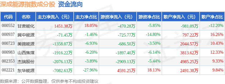 资金流向方面,深成能源(399680)指数成份股当日主力资金净流出合计1.11亿元,游资资金净流出合计2097.82万元,散户资金净流入合计1.32亿元。成份股资金流向详情见下表: