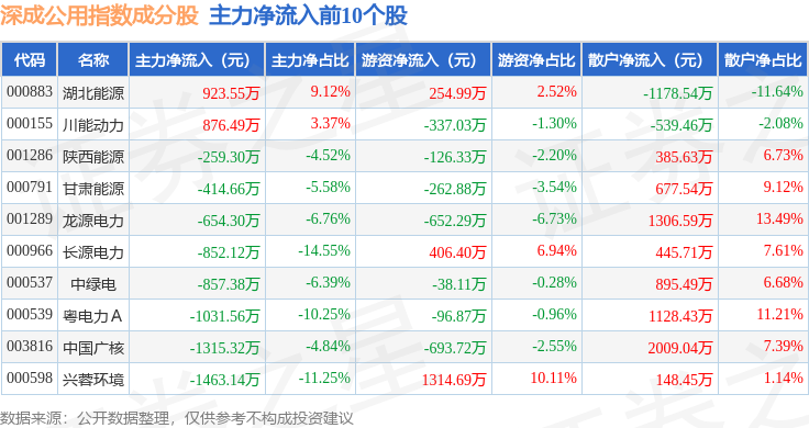 资金流向方面,深成公用(399689)指数成份股当日主力资金净流出合计3.09亿元,游资资金净流入合计1.21亿元,散户资金净流入合计1.88亿元。成份股资金流向详情见下表: