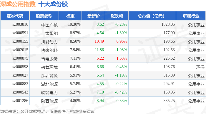 证券之星消息,9月30日,深成公用(399689)指数报收于837.43点,跌0.38%,成交33.3亿元,换手率0.6%。当日该指数成份股中,上涨的有2家,吉电股份以1.63%的涨幅领涨,下跌的有14家,协鑫能科以1.98%的跌幅领跌。