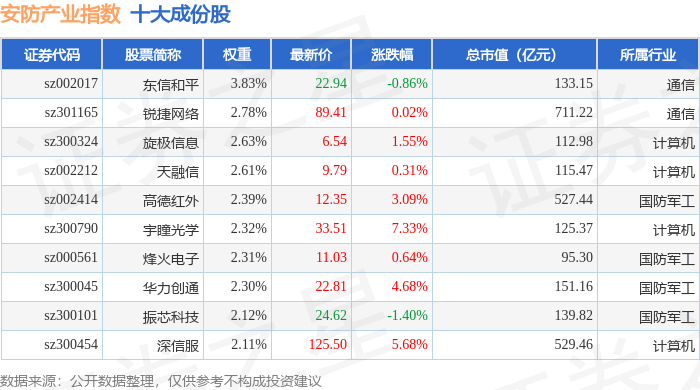 安防产业(399693)指数十大成份股详情如下: