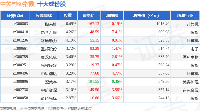 中关村60(399697)指数十大成份股详情如下: