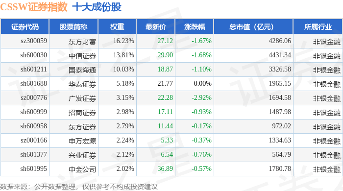 证券之星消息,9月30日,CSSW证券(399707)指数报收于6836.87点,跌1.03%,成交769.88亿元,换手率1.96%。当日该指数成份股中,上涨的有6家,国盛金控以9.99%的涨幅领涨,下跌的有41家,广发证券以2.92%的跌幅领跌。