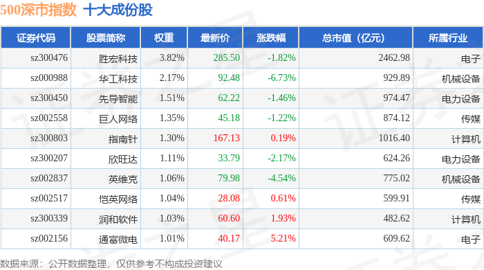 500深市(399802)指数十大成份股详情如下: