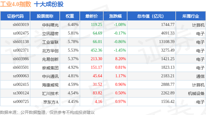 证券之星消息,9月30日,工业4.0(399803)指数报收于5692.05点,涨0.61%,成交1314.02亿元,换手率2.39%。当日该指数成份股中,上涨的有40家,兆易创新以8.2%的涨幅领涨,下跌的有38家,华辰装备以5.15%的跌幅领跌。