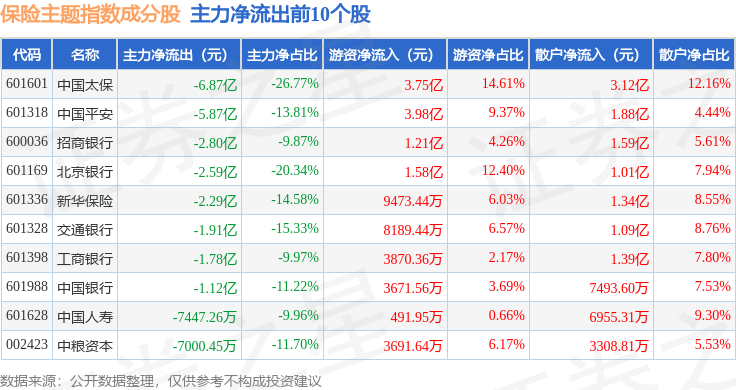 资金流向方面,保险主题(399809)指数成份股当日主力资金净流出合计28.26亿元,游资资金净流入合计12.91亿元,散户资金净流入合计15.35亿元。成份股资金流向详情见下表: