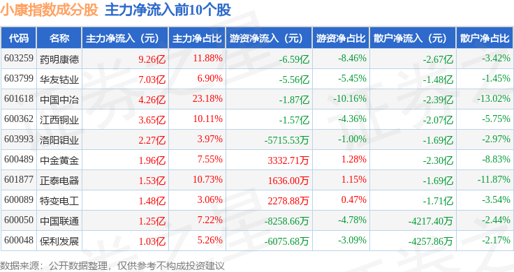 资金流向方面,小康指数(399901)成份股当日主力资金净流出合计50.2亿元,游资资金净流入合计17.47亿元,散户资金净流入合计32.73亿元。成份股资金流向详情见下表: