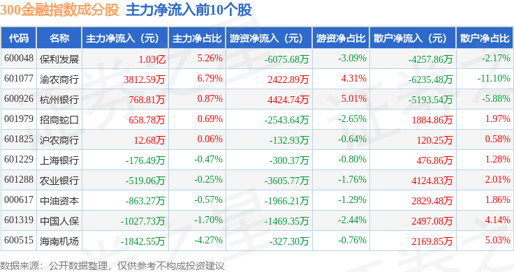 资金流向方面,300金融(399914)指数成份股当日主力资金净流出合计127.03亿元,游资资金净流入合计53.79亿元,散户资金净流入合计73.24亿元。成份股资金流向详情见下表: