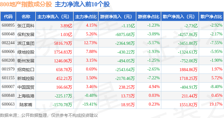 资金流向方面,800地产(399965)指数成份股当日主力资金净流入合计4.99亿元,游资资金净流出合计2.26亿元,散户资金净流出合计2.73亿元。成份股资金流向详情见下表: