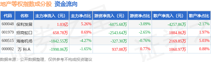 资金流向方面,地产等权(399983)指数成份股当日主力资金净流入合计7151.71万元,游资资金净流出合计8009.53万元,散户资金净流入合计857.82万元。成份股资金流向详情见下表: