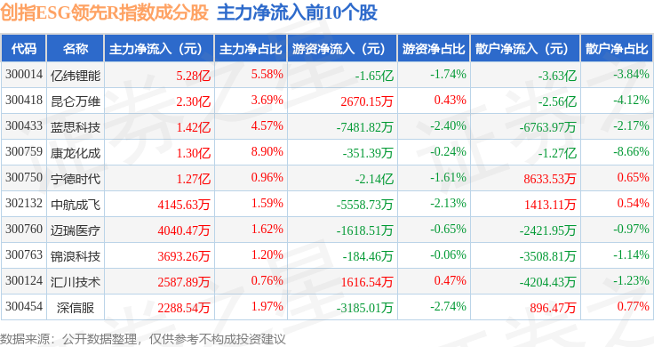 资金流向方面,创指ESG领先R(470031)指数成份股当日主力资金净流出合计57.18亿元,游资资金净流入合计23.53亿元,散户资金净流入合计33.65亿元。成份股资金流向详情见下表: