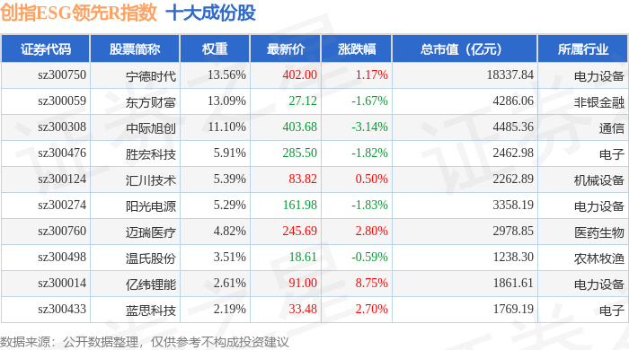 创指ESG领先R(470031)指数十大成份股详情如下: