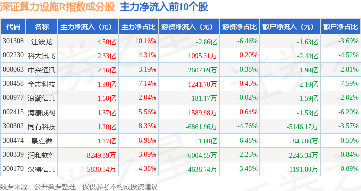 资金流向方面,深证算力设施R(470051)指数成份股当日主力资金净流出合计64.85亿元,游资资金净流入合计24.79亿元,散户资金净流入合计40.06亿元。成份股资金流向详情见下表: