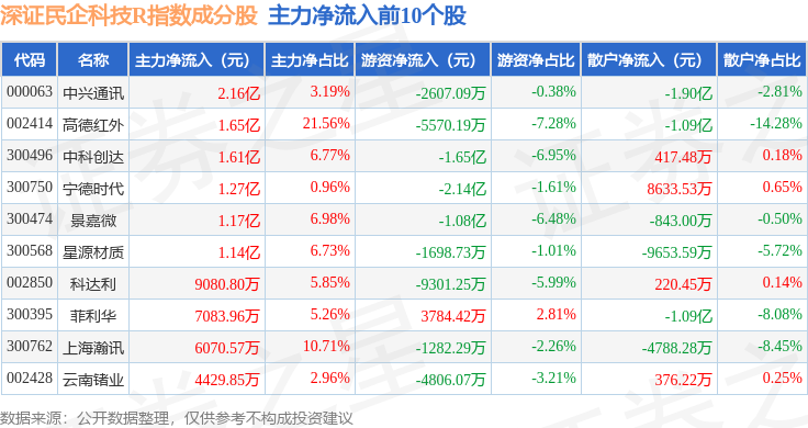 资金流向方面,深证民企科技R(470059)指数成份股当日主力资金净流出合计42.23亿元,游资资金净流入合计7.11亿元,散户资金净流入合计35.12亿元。成份股资金流向详情见下表: