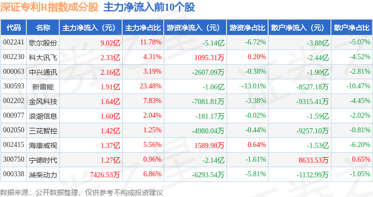 资金流向方面,深证专利R(470067)指数成份股当日主力资金净流出合计15.63亿元,游资资金净流入合计3.25亿元,散户资金净流入合计12.38亿元。成份股资金流向详情见下表: