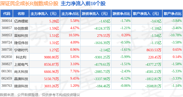 资金流向方面,深证民企成长R(470071)指数成份股当日主力资金净流出合计74.21亿元,游资资金净流入合计35.61亿元,散户资金净流入合计38.6亿元。成份股资金流向详情见下表: